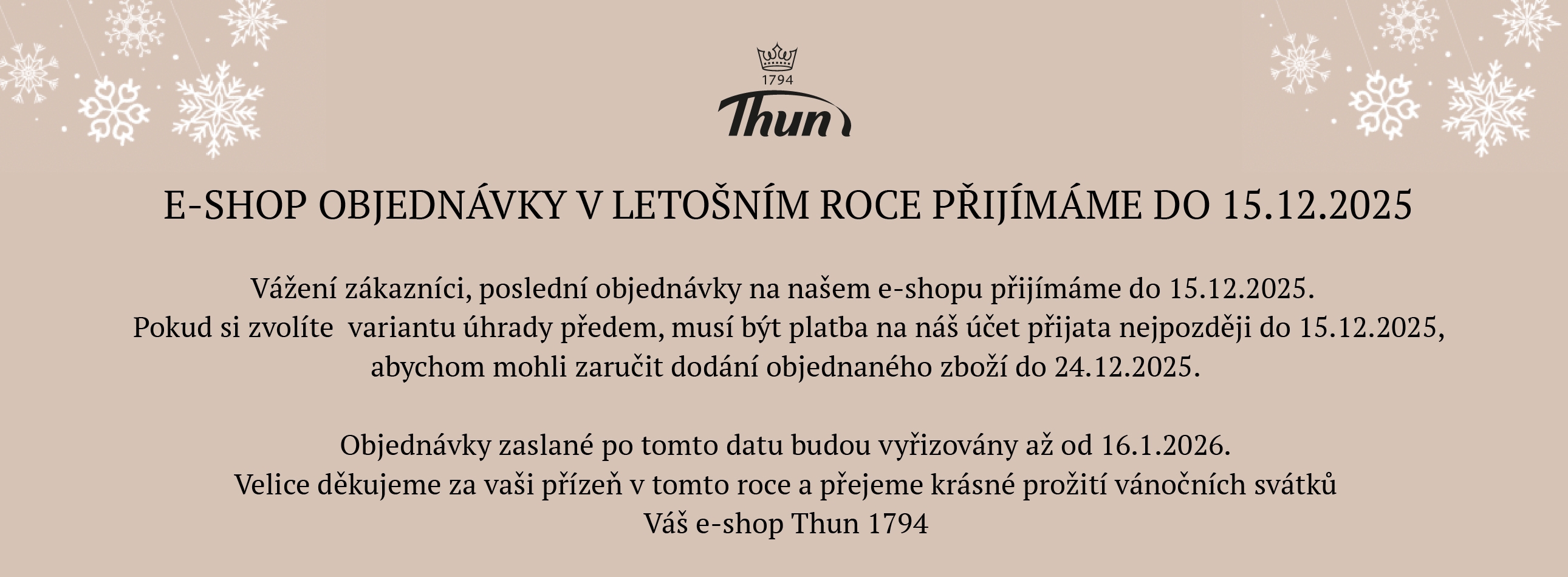 Thun 1794 a.s. je největší český výrobce porcelánu. Společnost má ve svém výrobním programu ucelené tvary užitkového či hotelového porcelánu, speciální varný program, porcelán pro děti a zakázkové zboží pro velké mezinárodní řetězce. Jedná se o specifický druh tzv. tvrdého porcelánu s vypalovací teplotou 1405°C. Vysoká kvalita a osobitý design vycházející z více než 220leté tradice výroby porcelánu v Čechách zaručuje vysoký uživatelský standard pro naše zákazníky. V nabídce našeho e-shopu naleznete jak kompletní porcelánové sady (jídelní, kávové, čajové, talířové či kompotové), tak jednotlivý kusový porcelán (hrnky, misky talíře, konvice), porcelán pro děti nebo pro slavnostní příležitosti.